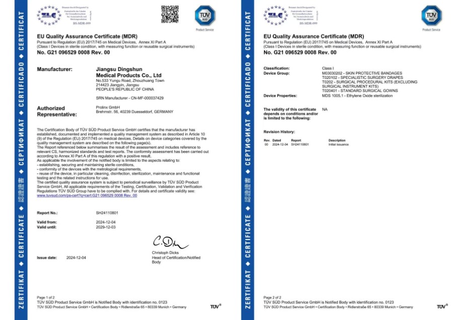 A Dingshun Medical já passou por muitas certificações internacionais, incluindo CE, MDR, FDA, ISO13485 e ISO9001.